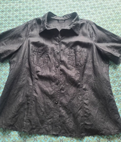 亚麻短袖,黑色,实体外贸店购入,全新仅过水。无标,衣服胸围124,肩宽43,衣长70,适合120-140斤左右穿。衣服做工特别精细,车缝线可看出精细程度。