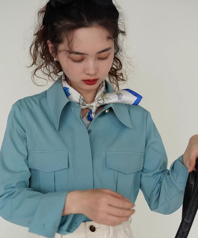 雾霾蓝大口袋金扣尖领衬衣